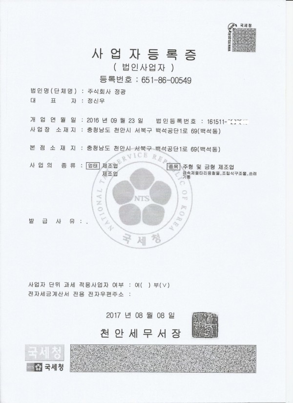 주소 : 31094 충청남도 천안시 서북구 백석공단 1로 69 ㈜정광 Tel :041-621-2886 Fax: 041-621-2888 Copyright © Jung kwang co.,ltd. All rights reserved.